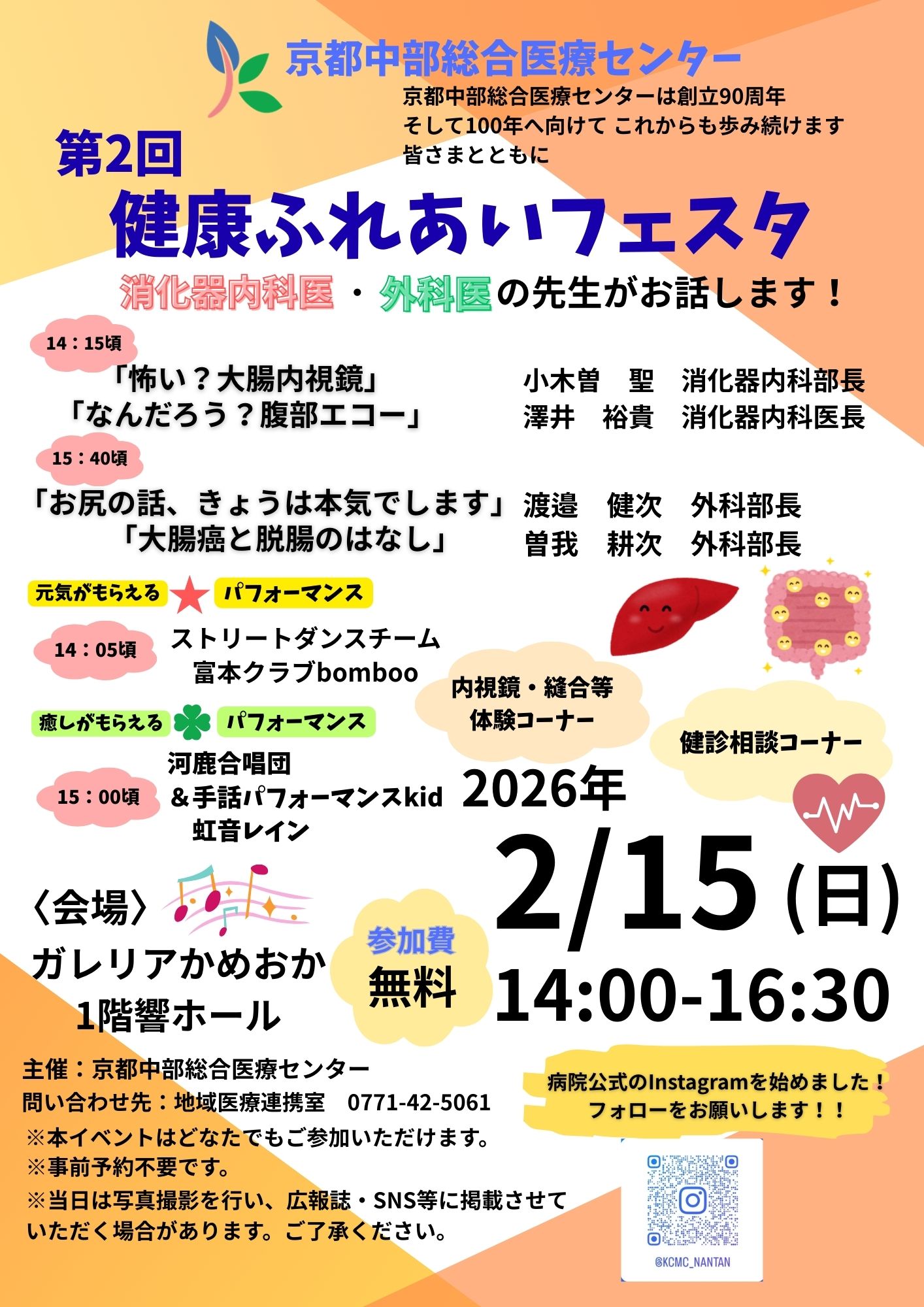 | 14:15~ | ・講演「怖い?大腸内視鏡」 (消化器内科部長 小木曽 聖) ・講演「なんだろう?腹部エコー」 (消化器内科医長 澤井 裕貴 ) |