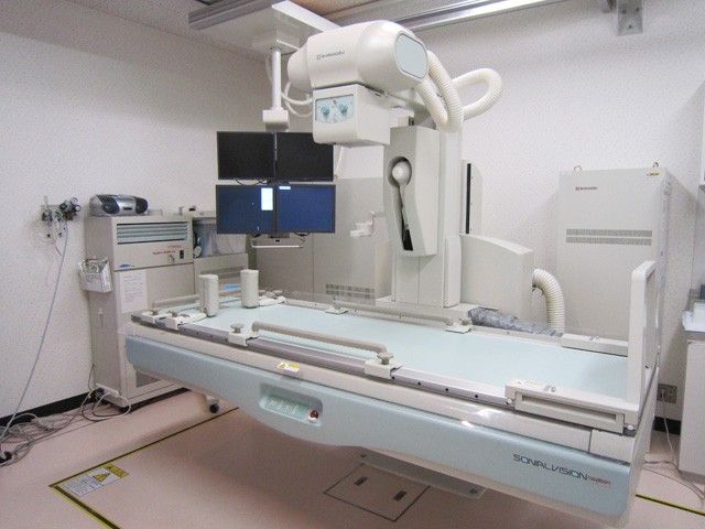 一般撮影装置は、日常の診断に利用され、短時間で検査が行える最も使用頻度の高い装置です。当院ではFPD(Flat panel detector:平面型検出器)システムが稼働しており、胸部、腹部、骨格系の撮影に使用しています。FPDは撮影から数秒で画像表示されるため、検査の流れがスムーズになり検査時間を短縮できます。また従来のシステムに比べて効率よくX線を検出できるため被ばく線量を抑えることができます。